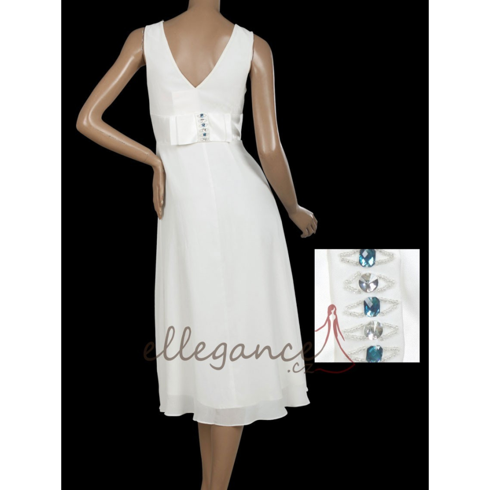 Elegantní šaty se slušivým "V" výstřihem, se širšími ramínky a sukní 3/4 délky, zvýrazněné širším saténovým páskem a zdobené drobnými a většími korálky.