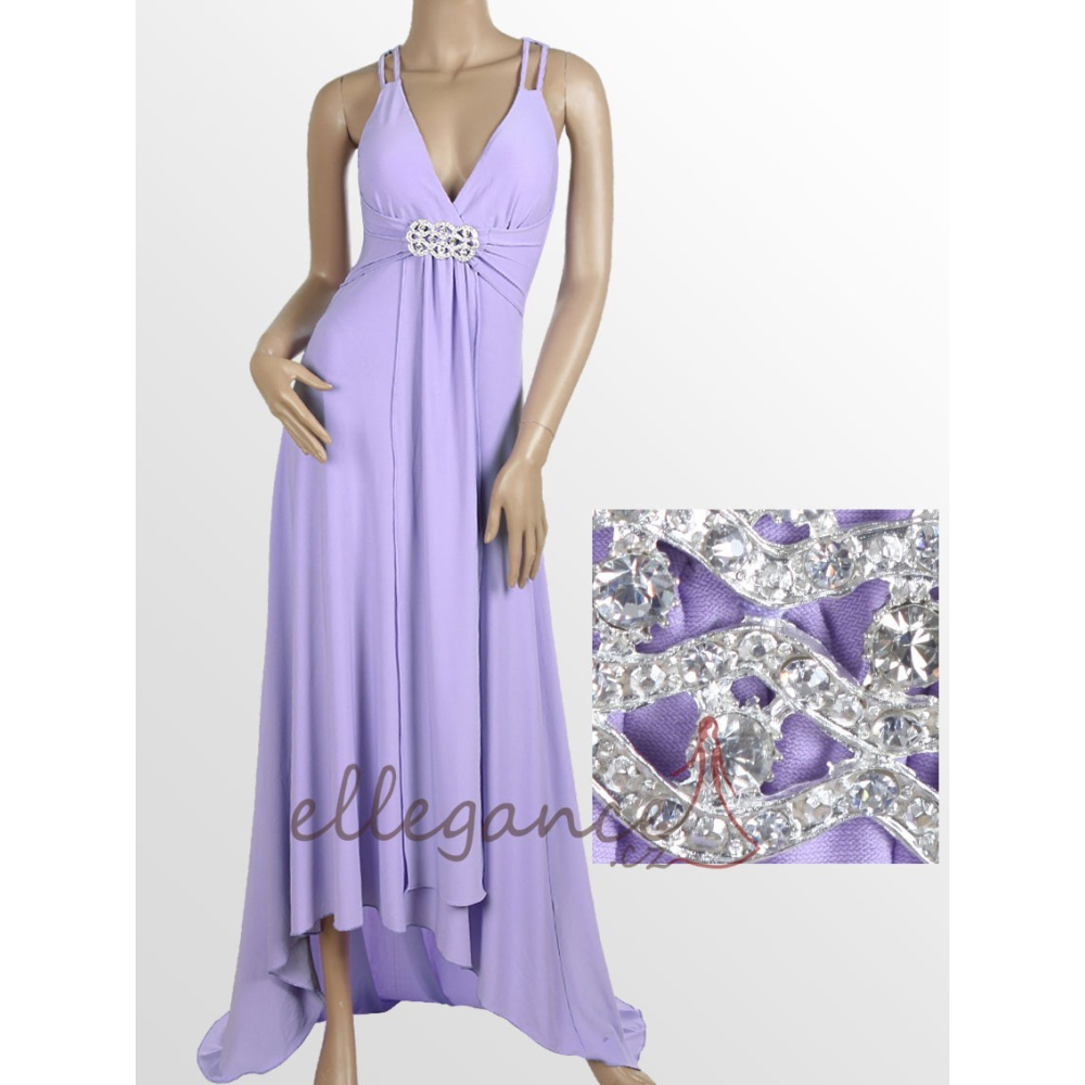 Elegantní šaty se slušivým "V" výstřihem, vpředu s dvojitými a vzadu širšími překříženými ramínky, se sukní prodlouženou do malé vlečky. Šaty jsou vpředu zdobené výraznou štrasovou sponou a svislou šerpou.