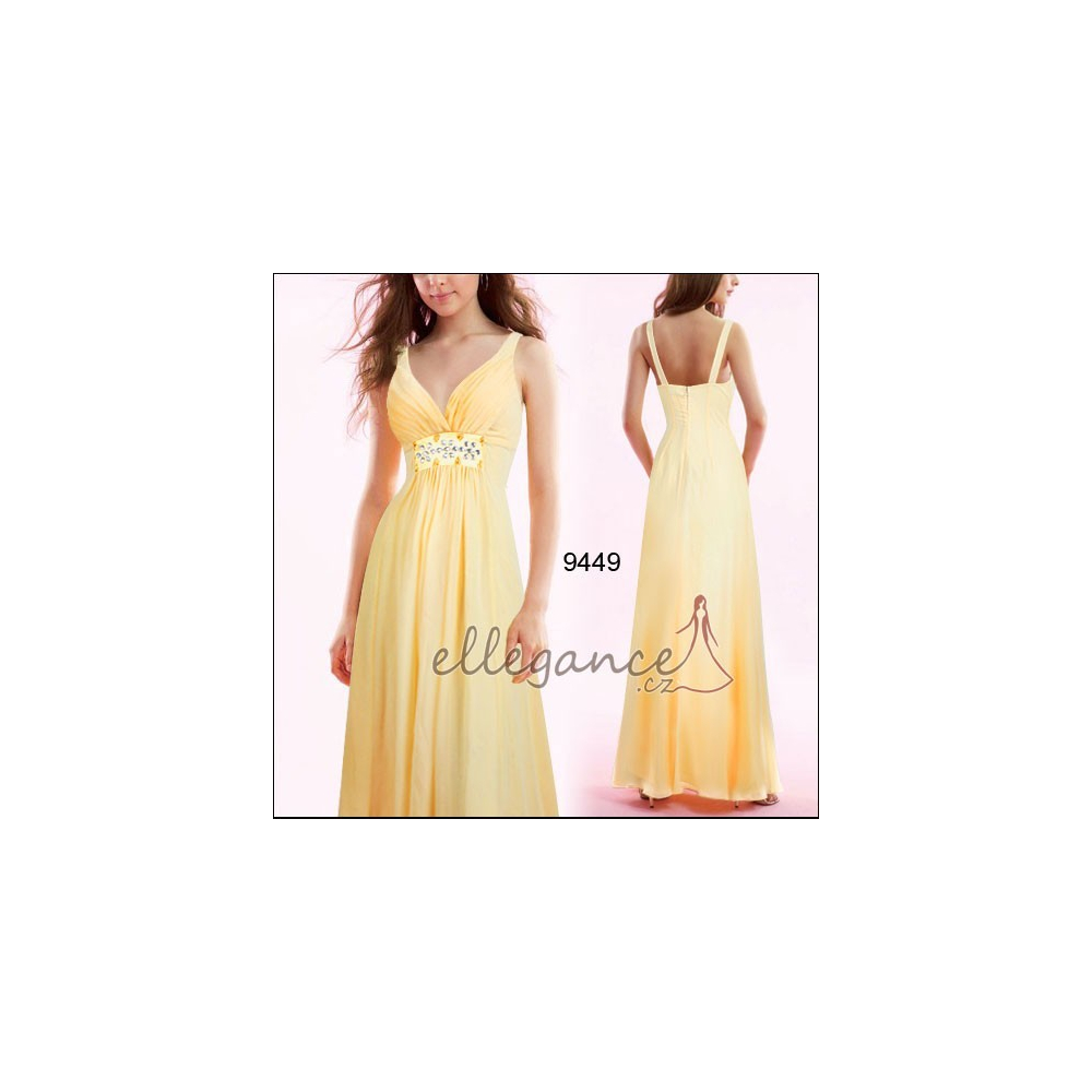 Elegantní společenské šaty v římském stylu, vpředu zdobené korálkovou aplikací.