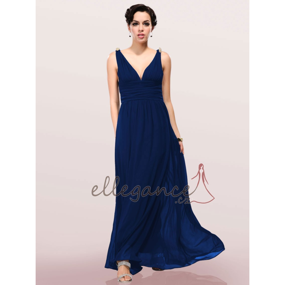 Elegantní společenské šaty v římském stylu, vpředu zdobené korálkovou aplikací. Barva: safírově...