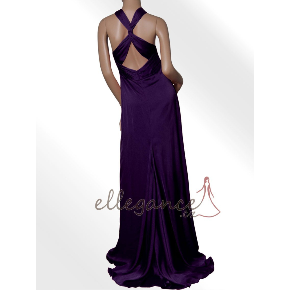 Elegantní šaty se slušivým "véčkovým" výstřihem a širšími vzadu překříženými ramínky, sukně je vzadu prodloužená do malé vlečky.
