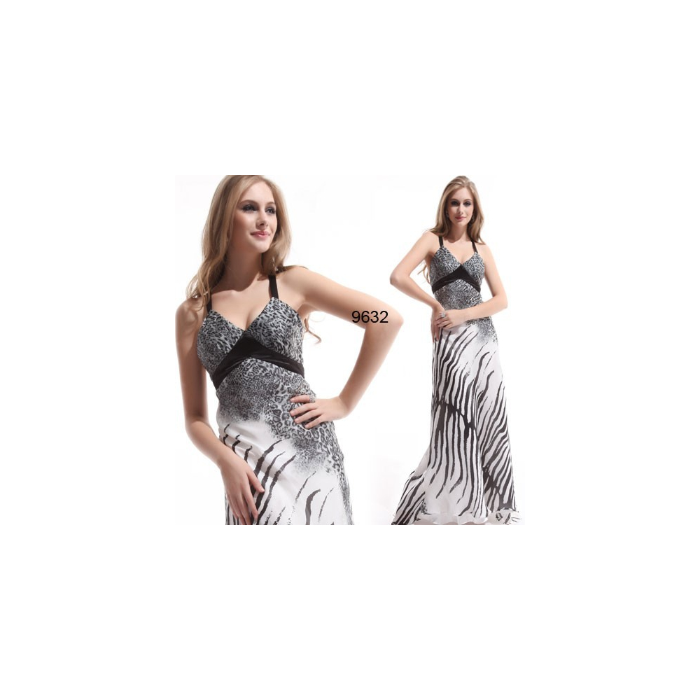 Elegantní společenské šaty s výrazným vzorem, s černými vzadu překříženými ramínky a se sukní prodlouženou do vlečky.