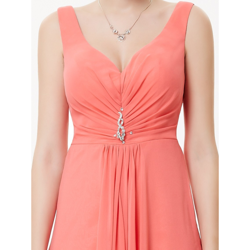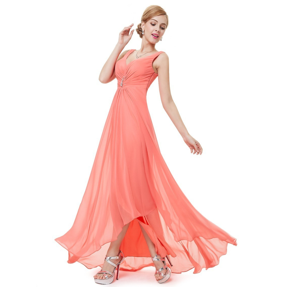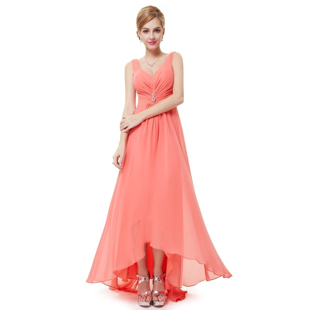 Elegantní společenské šaty s asymetrickou délkou sukně, s širšími ramínky a slušivým "V" výstřihem, zdobené vpředu na živůtku čtyřmi našitými štrasovými korálky a odnímatelnou štrasovou broží.
