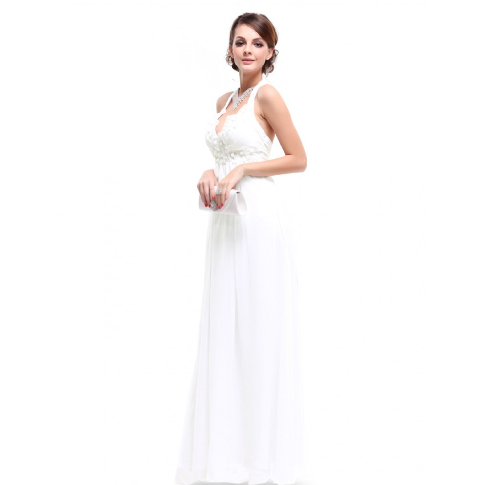 Elegantní dlouhé šaty s originálně řešenými zády, na živůtku zdobené krajkovou aplikací a drobnými štrasovými korálky.