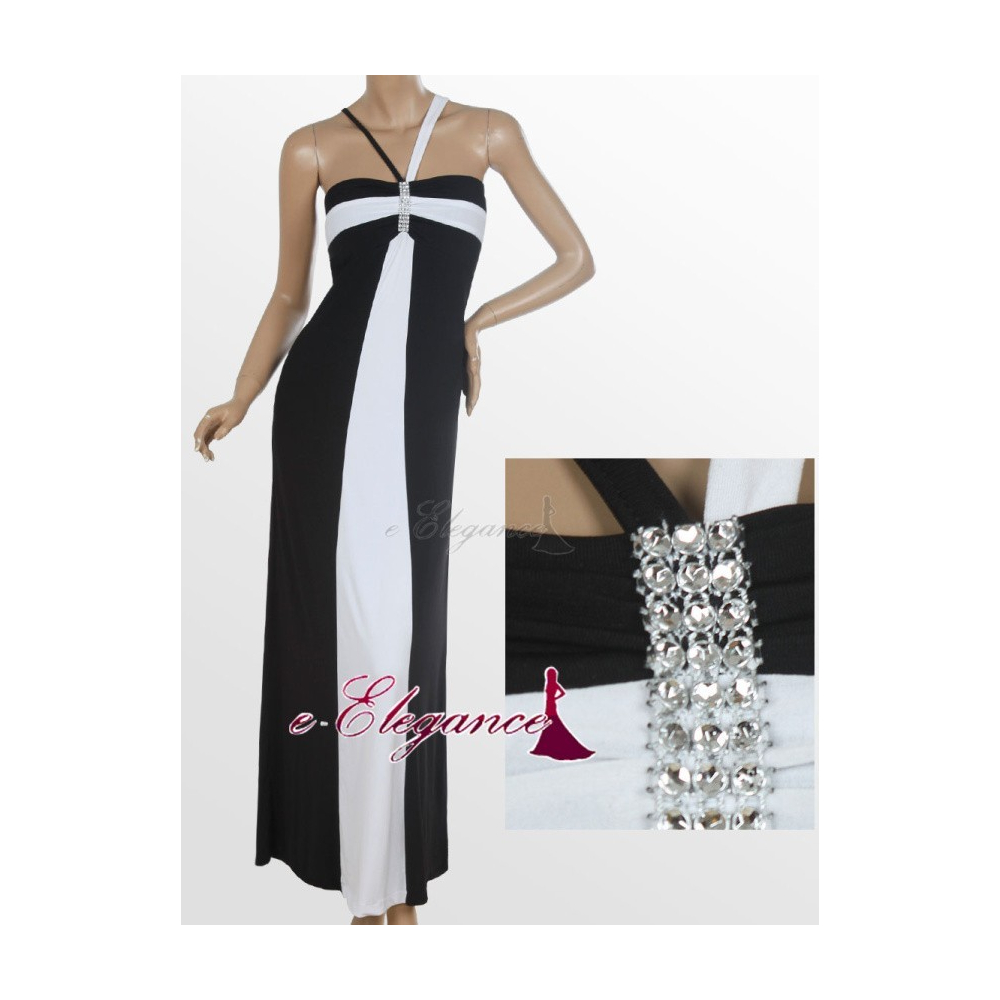 Elegantní společenské šaty se dvěma asymetricky širokými ramínky, vpředu zdobené stříbrnou ozdobou.